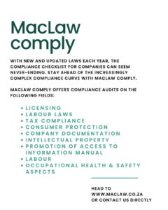 It's called MACLAW COMPLY and it's a compliance audit we can do on your business to verify its compliance with the plethora of laws and regulations governing businesses in South Africa - these include :