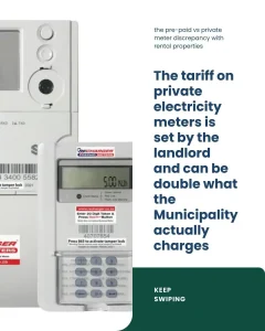 - Tenants complain that the private meter overcharge discrepancy can be as much as double with municipal charges of R750 giving 350 units of power and some private meters only 150 units for the same cost.