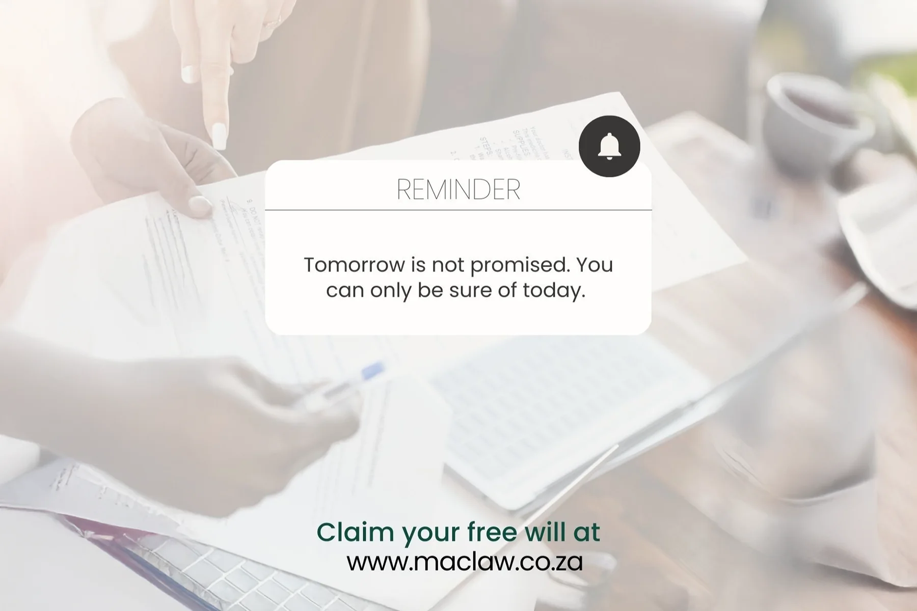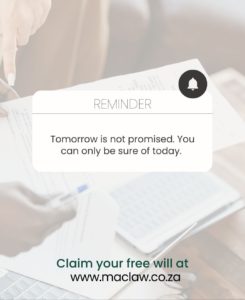Phone 0870210123 or email Mark at mark@maclaw.cdns.co.za to claim your free Will.