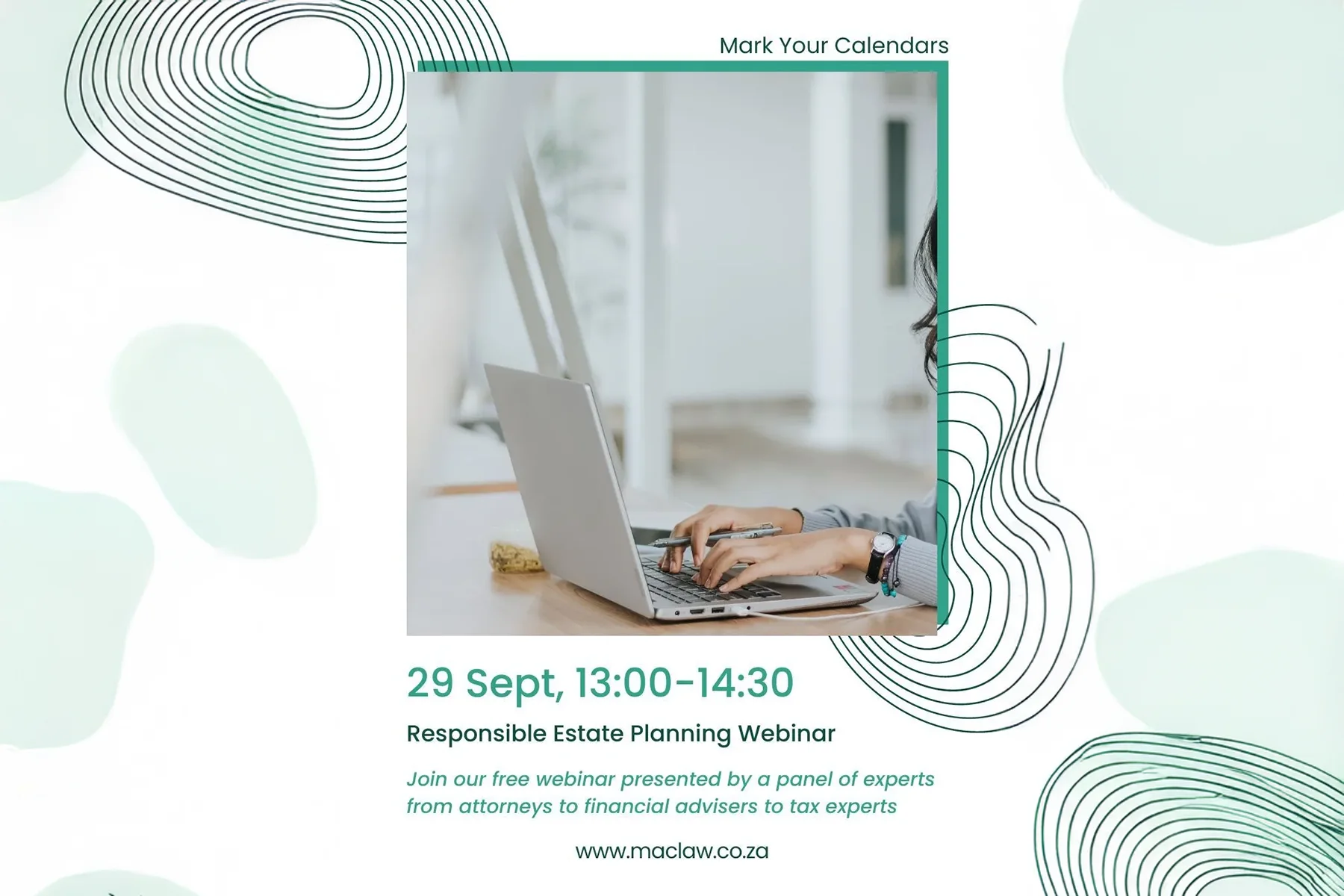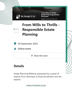 It's Webinar time and you can register to join us on Friday 29 September at 13.00 for our "Wills and Thrills" webinar, an Estate Planning Webinar presented by a panel of experts from attorneys to financial advisers and tax experts.